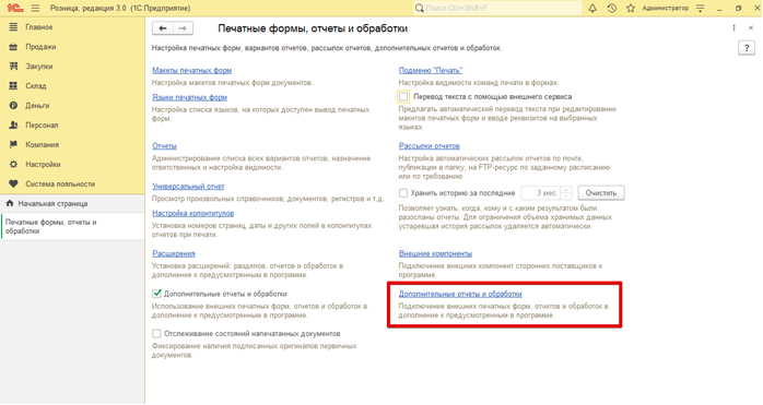 Далее перейти в раздел «Настойки» – «Печатные формы, отчеты и