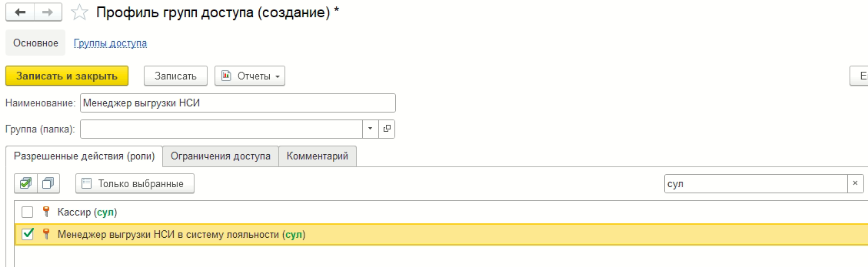 создаем новый Профиль- вводим Наименование - через строку поиска находим роль Менеджер выгрузки НСИ (сул)- Записать и закрыть.