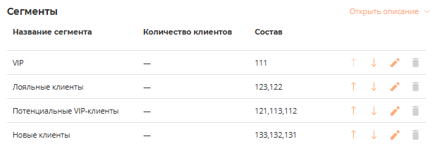 Клиент может располагаться только в одном сегменте. Если клиент попадает по условию в несколько сегментов, то система определит его в первый по приоритету сегмент. Приоритет настраивается кнопками  image.png.