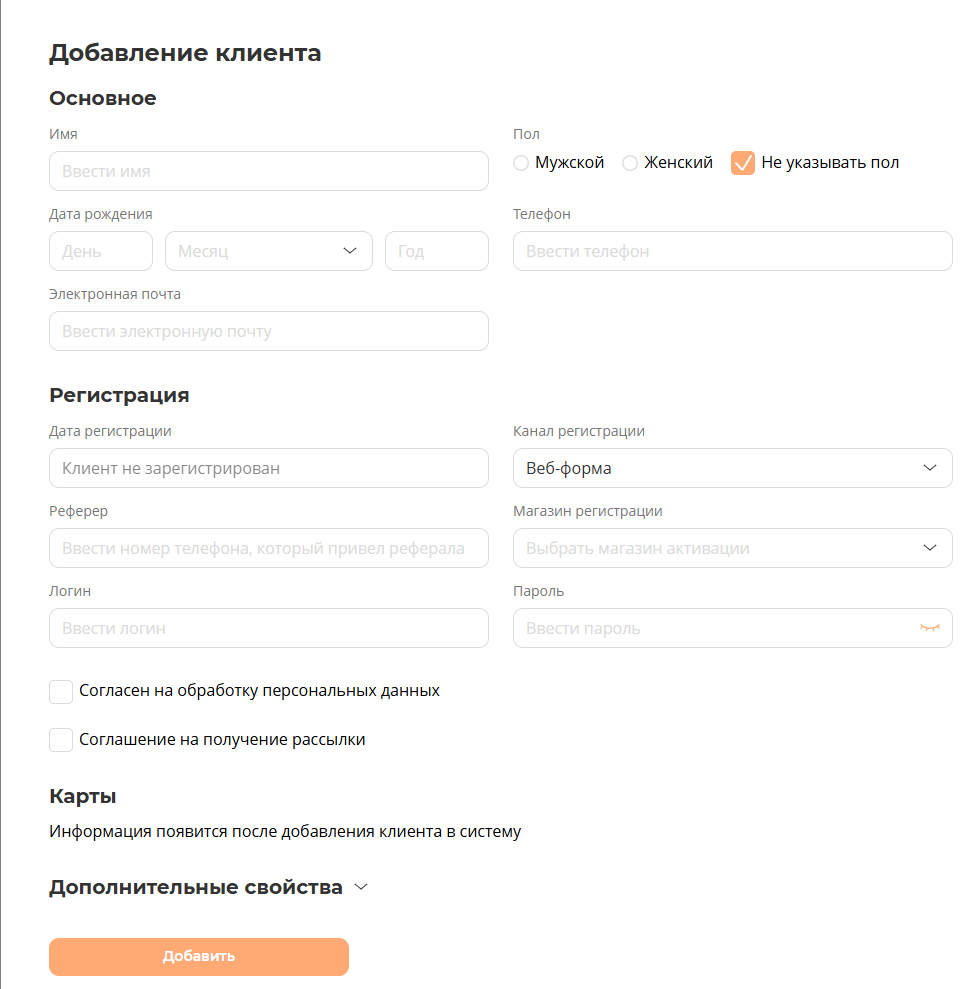 Форма карточки клиента: