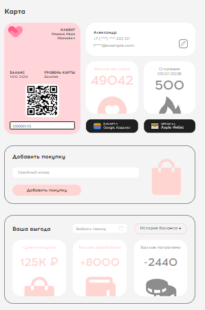 Wallet карты, Личный web кабинет - являются дополнительными услугами и подключаются отдельно по запросу. Запрос на подключение данных услуг можно оставить, на вкладке Личного кабинета клиента, с помощью кнопки Подключить или ознакомиться подробнее через Смотреть демо image.png