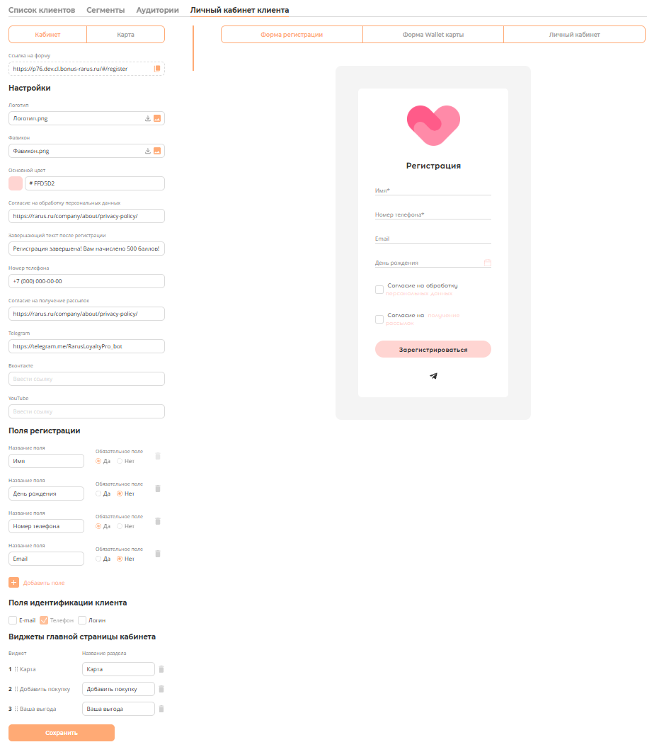 В данном разделе маркетолог может самостоятельно настраивать внешний вид и сведения формы регистрации клиента для сайта, Wallet карты, Личного web кабинета клиента. Так же в данном разделе настраивается вид карты клиента для личного web кабинета и telegram.