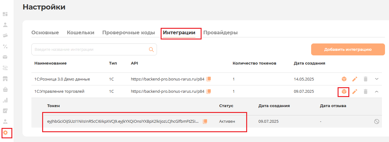В разделе Настройки - на вкладке Интеграции создаем интеграцию для связи Системы управления лояльности с 1С и сайтом.
