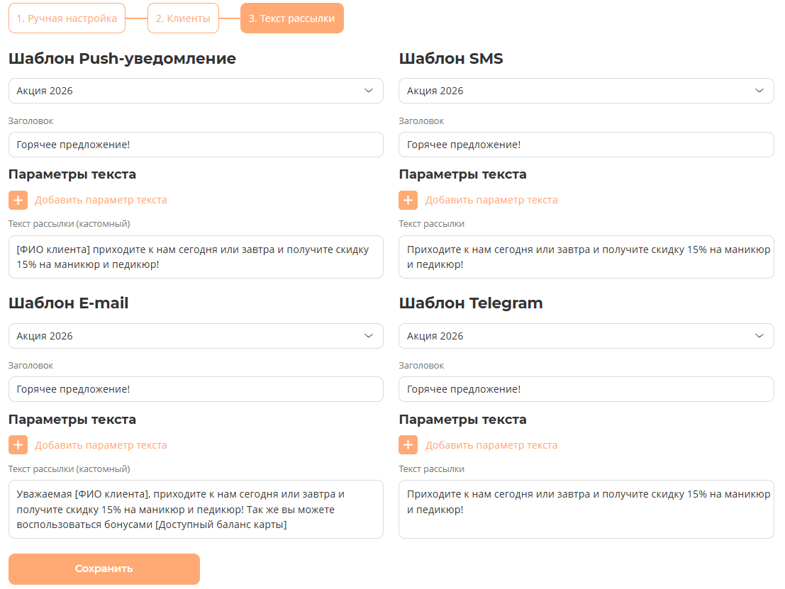 Вы можете выбрать отдельный шаблон для каждого канала коммуникации — Push-уведомления, E-mail, SMS или Telegram — и сразу же изменить текст прямо в интерфейсе создания рассылки.