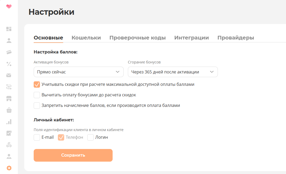 В разделе Настройки - на вкладке Основные, задаем общие для системы лояльности правила Активации бонусов, правила Сгорания бонусов, правила начисления и использования бонусов при покупках (данные правила срабатывают для всех бонусов, у которых не заданы индивидуальные правила срабатывания) и правила идентификации клиента в личном кабинете.