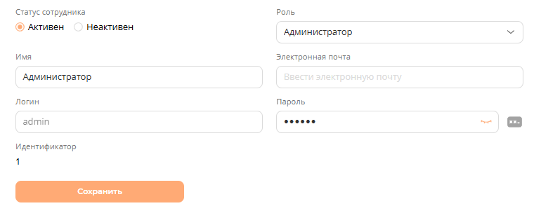 - Активен – сотруднику разрешен вход в личный кабинет.