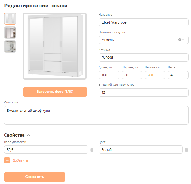 В карточке товара есть поля: